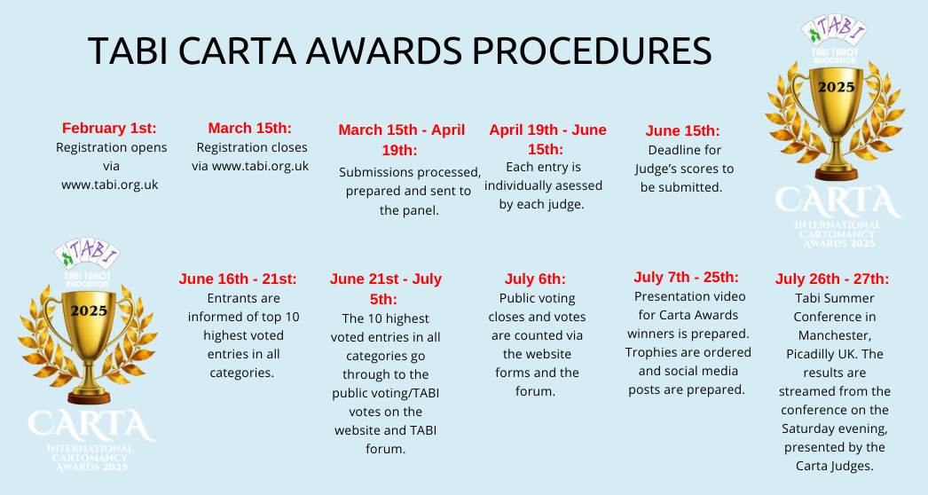 Did you publish or self-publish a Tarot or Oracle Deck or Book in 2024? Then be sure to enter the 2025 TABI CARTA Awards! Registration begins on February 1st, 2025!
